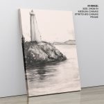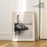 Wall Decor | Abstract grayscale hand drawing lighthouse and sea | Custom Size & Frame • Ready to Hang • Made in India • Eco-Friendly