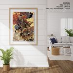 - Material: You can choose between different print mediums (Glicee paper or Canvas) and 40+ framing options that you can see on the website. Any order above 18x24 inches is processed in pinewood since synthetic wood is not able to bear its load. Wherever applicable, acrylic glass is used instead of normal glass, for its ease of handling and recyclability.