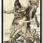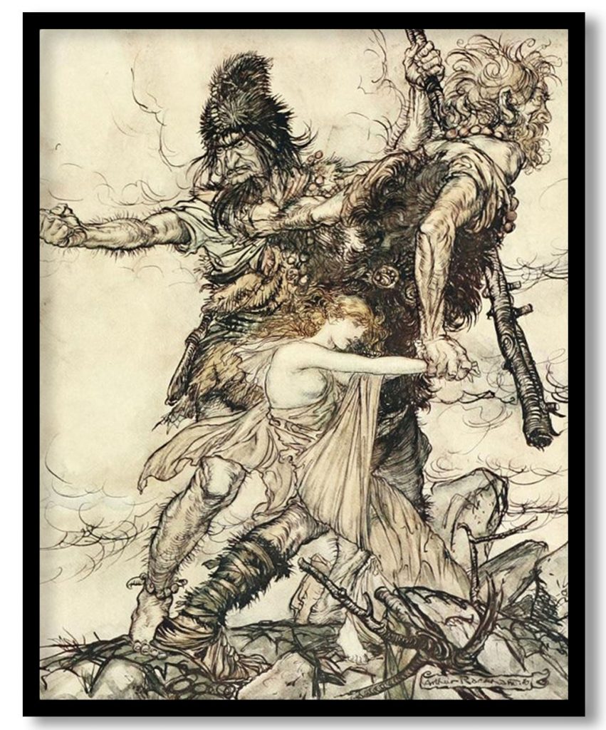 Wall Art | Fasolt suddenly seizes Freia and drags her to one side with Fafner by Arthur Rackham (Date Unknown) | Small to XXXL Sizes • 50+ Framing Styles • Non Toxic