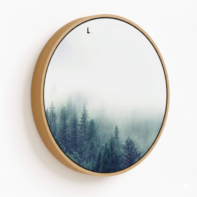 Wall Decor | foggy forest and bird #03 - Circular Wooden Frames | Custom Size & Frame • Ready to Hang • Made in India • Eco-Friendly