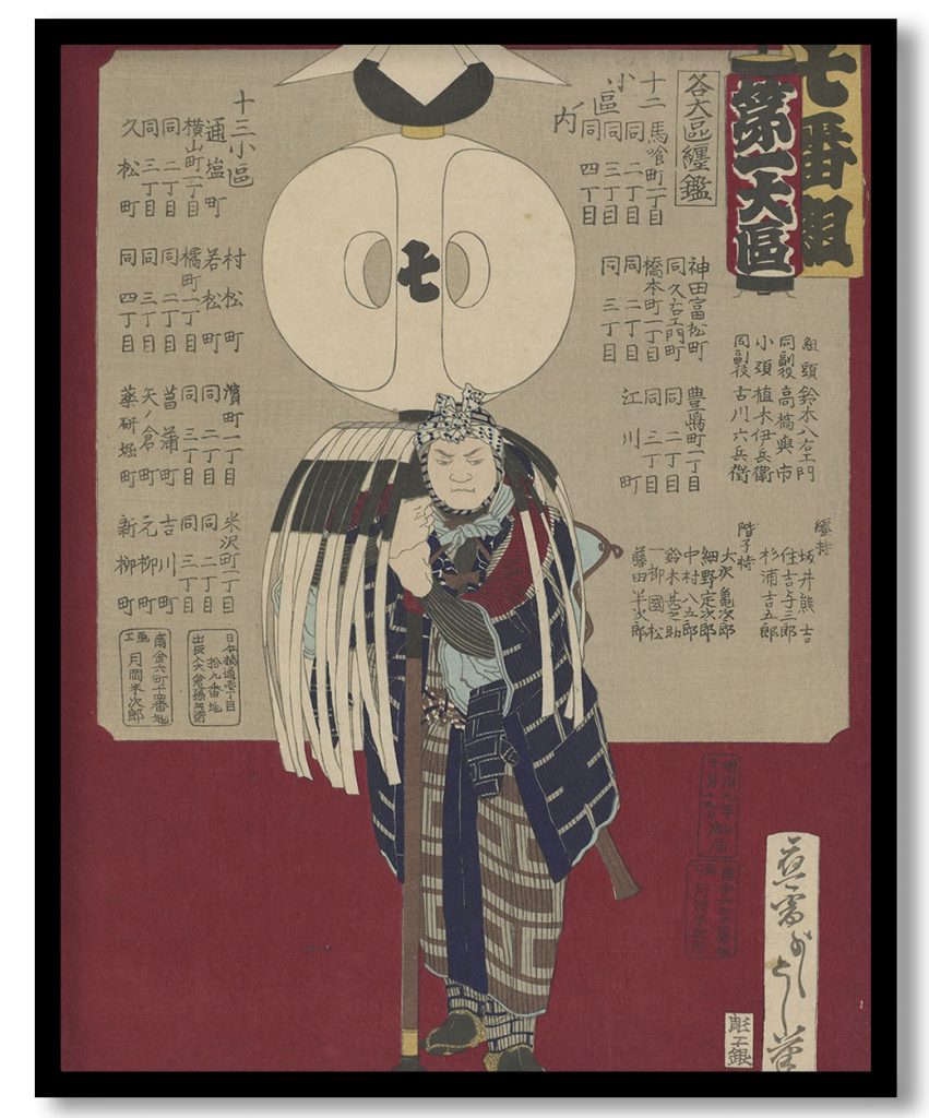 Framed Art | Frontal view of a fireman holding the standard for district seven, from the series Firemen's Standards of all Great Districts by Tsukioka Yoshitoshi (1876) | 50+ Frame Styles • Museum Quality • Made in India