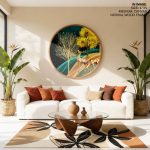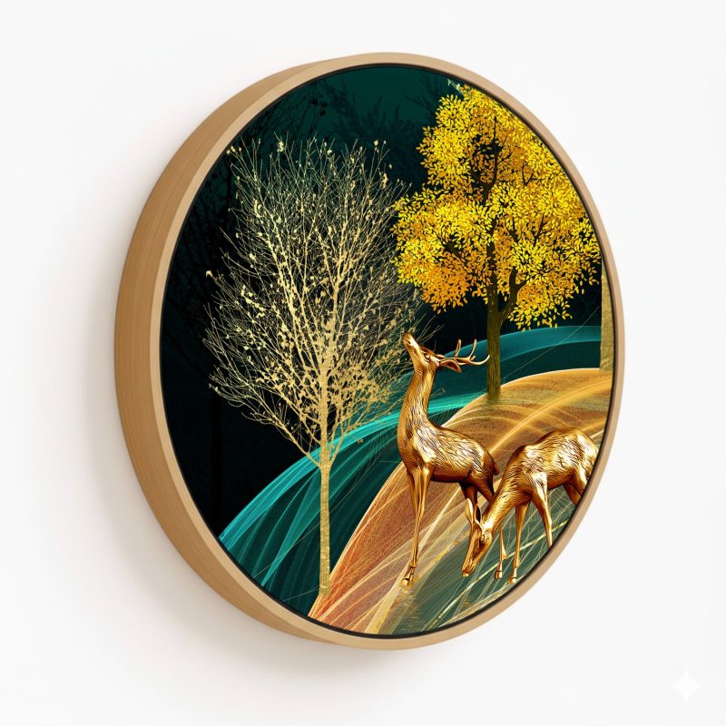 Wall Decor | Golden illustrative landscape - Circular Wooden Frame | Custom Size & Frame • Ready to Hang • Made in India • Eco-Friendly
