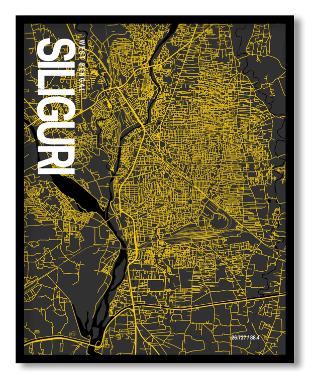 Wall Art | Siliguri Map Art, Yellow-Black, Poster style, Framed & Ready to hang wall art | Small to XXXL Sizes • 50+ Framing Styles • Non Toxic