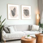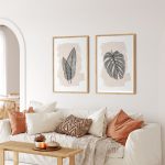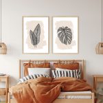 Set of 2 abstract minimalistic line drawing banana palm leaves botanical