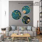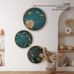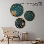 Set of 3 Golden Blue Sapphire Lotus Fishes - Circular Wooden Frames - Wall Art, Hanging Wall Decor, Home Decor - BestOfBharat