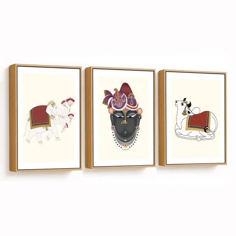 Wall Art | Set of 3 pichwai art shrinathji and cow | Small to XXXL Sizes • 50+ Framing Styles • Non Toxic