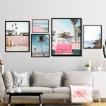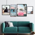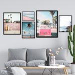Set of 5 pink van beach surf and palm tree - Wall Art Decor, Framed Painting, Home Decor - BestOfBharat