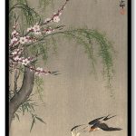 Two Barn Swallows in Flight, Willow Branch and Flowering Cherry above by Ohara Koson (1910)