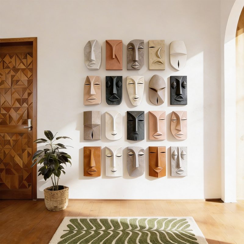 Minimalist 3D wall sculptures inspired by tribal abstraction. Each face captures a quiet emotion — not through expression, but through form.